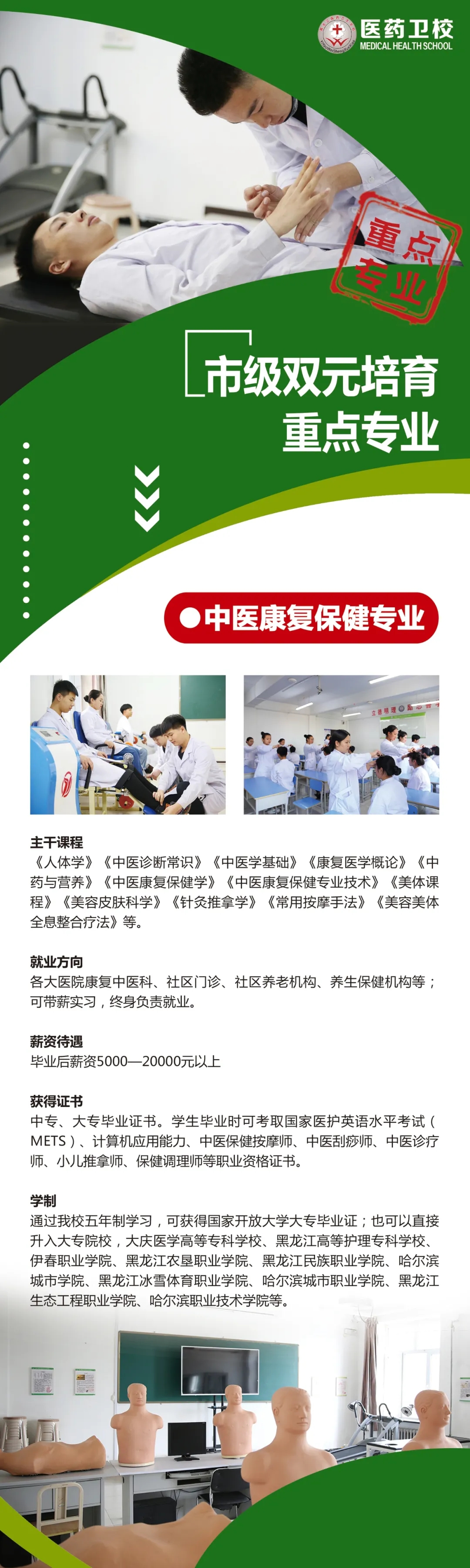 中醫(yī)健康保健事業(yè)的快速發(fā)展,需要一大批能直接提供康復(fù)保健服務(wù)的高技能中醫(yī)技術(shù)人才。我校專業(yè)上的成就不單能幫助本專業(yè)學(xué)生掌握更全面專業(yè)基礎(chǔ)理論和技能,更能幫助中醫(yī)保健事業(yè)培養(yǎng)和儲(chǔ)備更多優(yōu)質(zhì)人才。