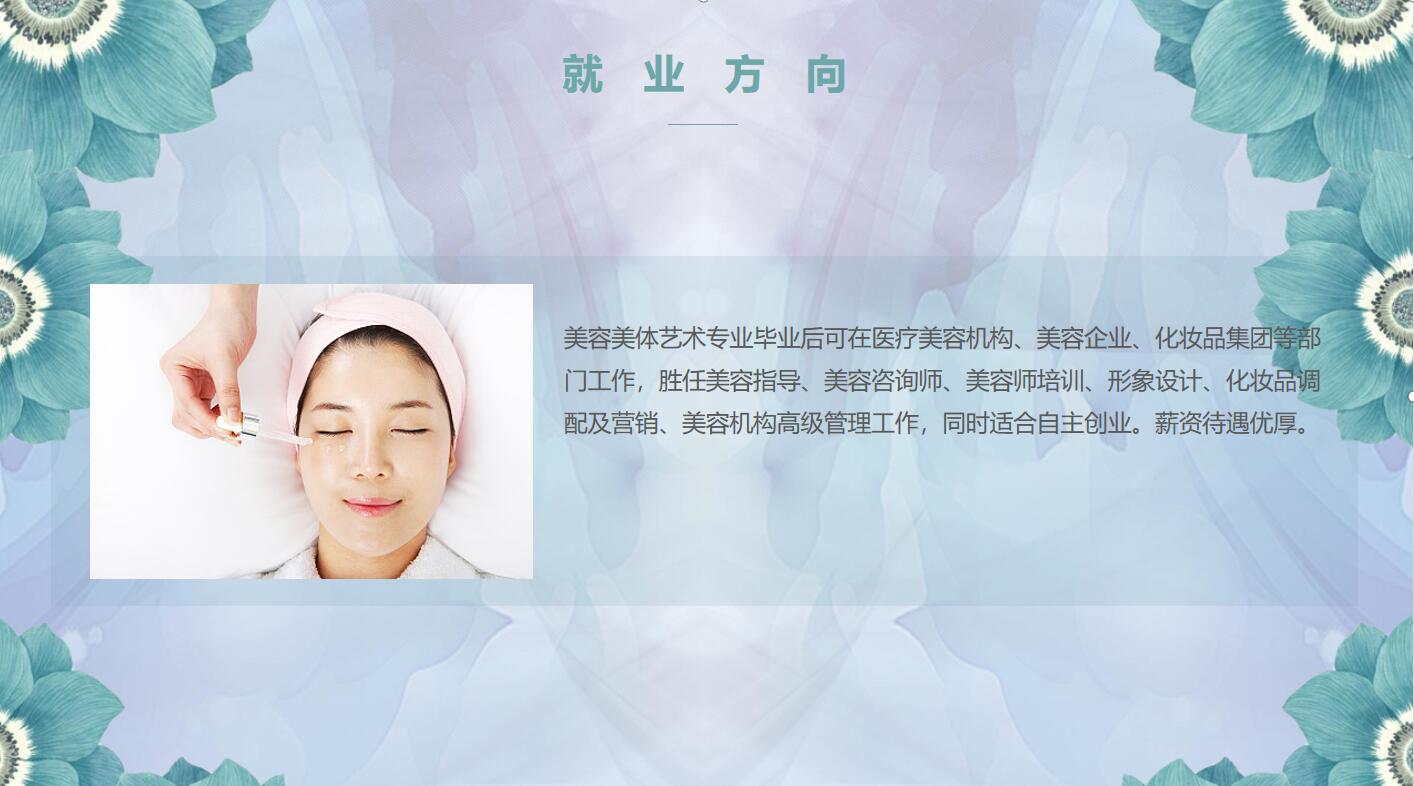 美容美體藝術專業(yè)畢業(yè)后可在醫(yī)療美容機構(gòu)、美容企業(yè)、化妝品集團等部門工作,勝任美容指導、美容咨詢師、美容師培訓、醫(yī)學美容微整形、形象設計、化妝品調(diào)配及營銷、美容機構(gòu)高級管理工作,同時適合自主創(chuàng)業(yè)。我校畢業(yè)生供不應求,一人多崗,歷年就業(yè)率均接近 100%。