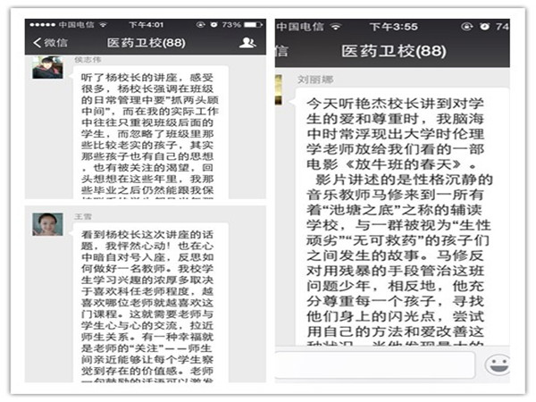 在群聊過(guò)程中,很多老師發(fā)表了自己的感想,也有老師反省了自己的不足,公共教研室侯志偉老師說(shuō)道:“聽(tīng)了楊校長(zhǎng)的講座,感受很多,楊校長(zhǎng)強(qiáng)調(diào)在班級(jí)的日常管理中要‘抓兩頭顧中間’,而在我的實(shí)際工作中往往只重視班級(jí)后面的學(xué)生,而忽略了班級(jí)里那些比較老實(shí)的孩子,其實(shí)那些孩子也有自己的思想,也有被關(guān)注的渴望,回頭想想在這些年里,那些畢業(yè)之后仍然能跟我保持聯(lián)系的學(xué)生都是當(dāng)年所謂的‘問(wèn)題學(xué)生’。而那些聽(tīng)話的孩子現(xiàn)在在哪?工作怎么樣?我真是不知道!想想其實(shí)挺遺憾的,而原因肯定在我!對(duì)于這一點(diǎn),在今后的工作中我會(huì)盡量改進(jìn)!”侯老師這種反思正是學(xué)校講壇的最終目的——分享與成長(zhǎng)!