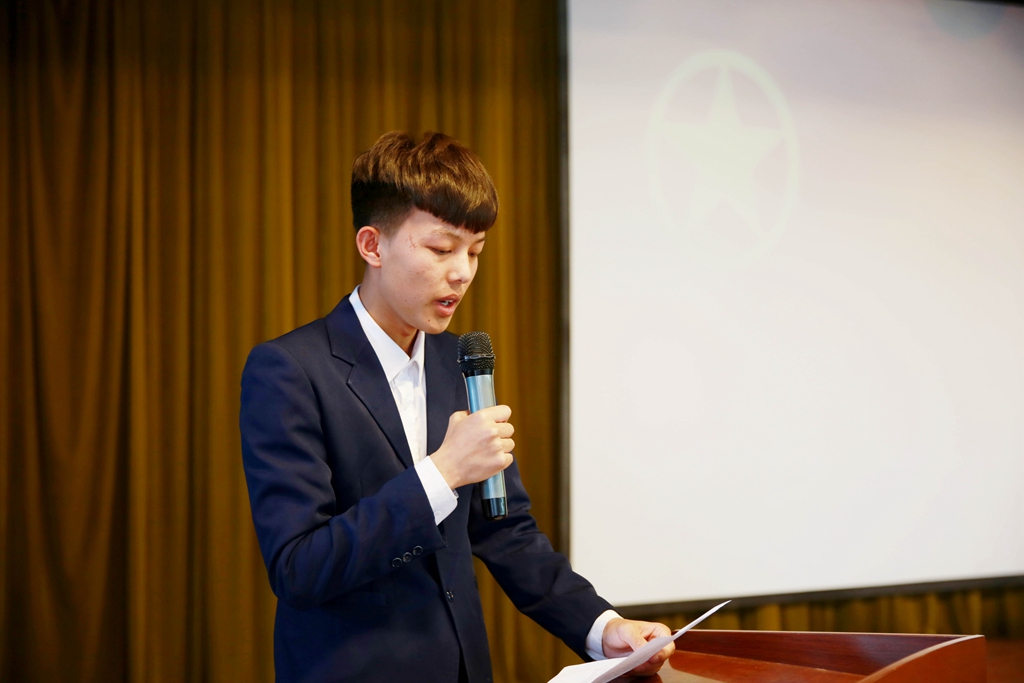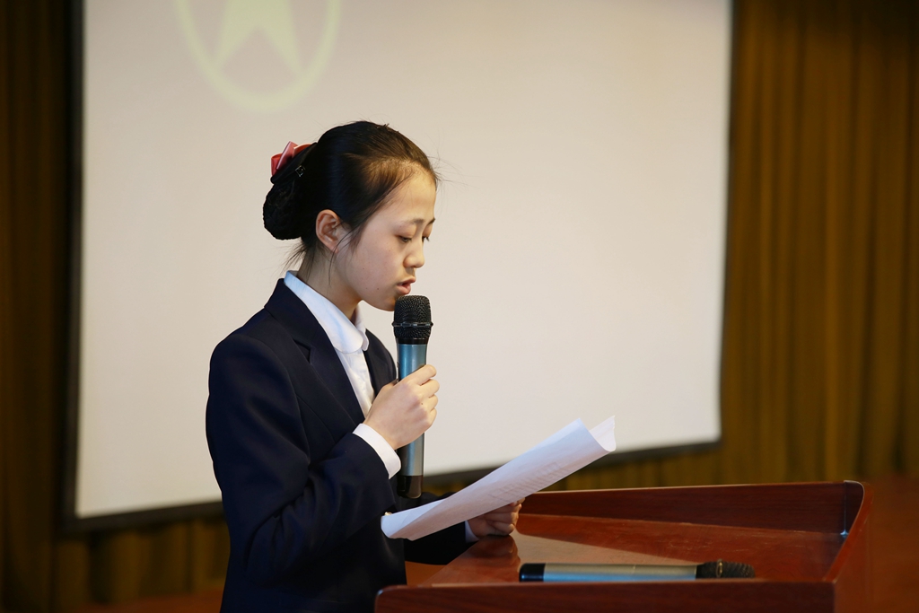 在肅穆的國歌中入團儀式拉開序幕。首先由團委書記宣布新團員入團審批決定并宣讀新團員名單。隨后校領(lǐng)導(dǎo)為新團員們帶上象征共青團的團徽,這標(biāo)志著他們驕傲的成為了共青團的一員。