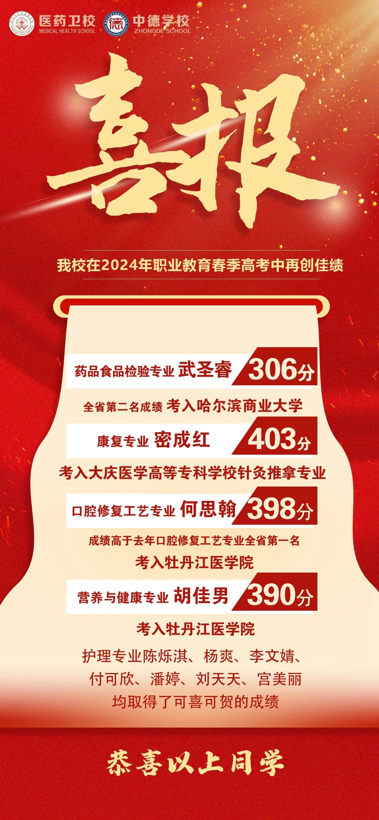 在2024年職業(yè)教育高考中,我校藥品食品檢驗(yàn)專業(yè)武圣睿同學(xué)以全省第二名的成績成功考進(jìn)哈爾濱商業(yè)大學(xué)。康復(fù)專業(yè)密成紅以403分考入大慶醫(yī)學(xué)高等??茖W(xué)校針灸推拿專業(yè)。口腔修復(fù)工藝專業(yè)何思翰以398分(成績高于去年口腔修復(fù)工藝專業(yè)全省第一名)考入牡丹江醫(yī)學(xué)院。營養(yǎng)與健康胡佳男390分考入牡丹江醫(yī)學(xué)院。護(hù)理專業(yè)陳爍淇,楊爽,李文婧,付可欣,潘婷,劉天天,宮美麗均取得了可喜可賀的成績。
