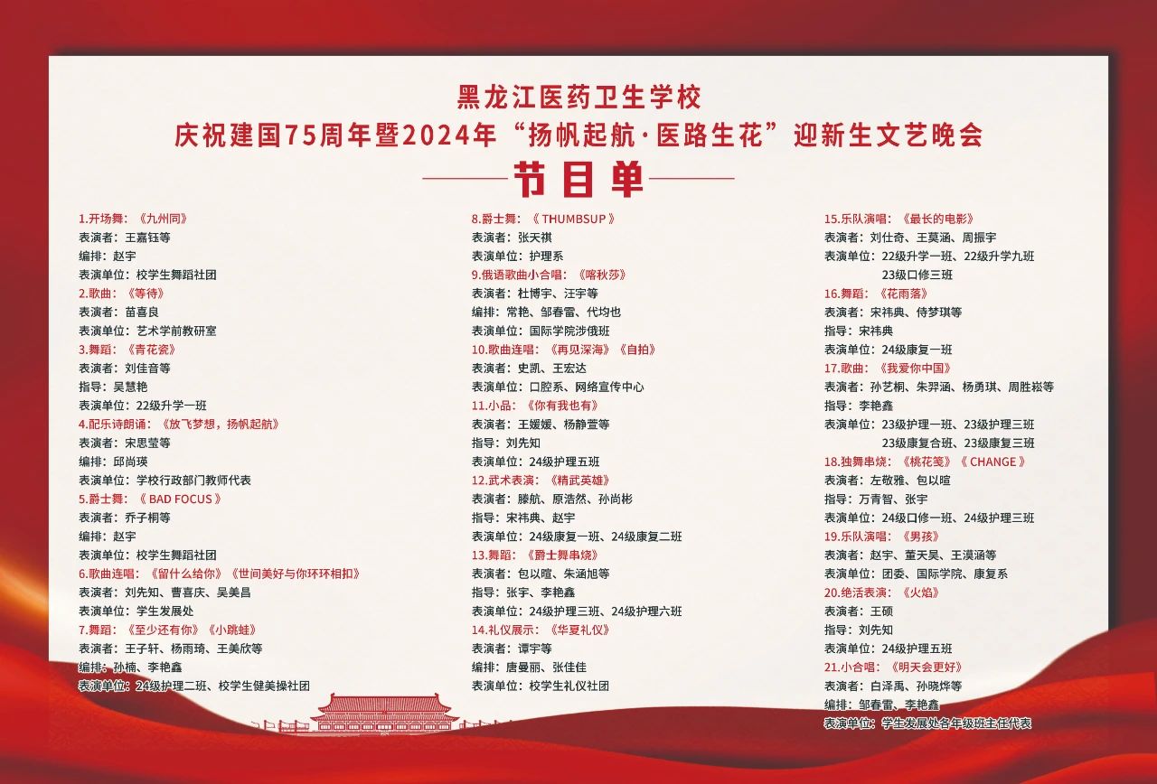 在這個(gè)充滿希望與活力的季節(jié),我們即將迎來偉大祖國的第75個(gè)生日!為了表達(dá)我們對(duì)祖國的熱愛和祝福,同時(shí)歡迎新同學(xué)加入黑龍江醫(yī)藥衛(wèi)生學(xué)校這個(gè)大家庭,學(xué)校各部門經(jīng)前期精心策劃和緊張籌備,為慶祝建國 75 周年暨 2024 年“揚(yáng)帆起航?醫(yī)路生花”迎新生文藝晚會(huì),于9月26日(周四)16:30在校運(yùn)動(dòng)場(chǎng)精彩呈現(xiàn)。黑龍江醫(yī)藥衛(wèi)生學(xué)校師生全員參加晚會(huì)。